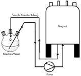 The use of NMR as a reaction-monitoring tool has increased in recent years (3, 4). The basic process involves removing a flowing stream of the reaction mixture from the reactor vessel, which is then pumped to the magnet using tubing. There, it enters a flow cell in the rf coil region of the probe before being returned to the reaction vessel (see Figure 1). The volume removed from the reactor at any one time is typically less than 5 mL; h flow rates depend on the experimental setup, but should be slow enough to give sufficient residence time in the high magnetic field region to assure adequate polarization and minimize the T1 bias to peak areas (5).