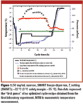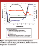 Cycle design by manometric temperature measurement. Figure 1 illustrates the cycle recipe obtained for 50 mg/mL sucrose. The recipe is optimized for the type of excipient, individual Tc of the product, and container system. Note that Ts was automatically lowered by the software after about 6 h to account for a continuous increase in Tp toward the end of primary drying, caused by an increase in Rp (see Figure 4). Product temperature at the sublimation interface did not exceed the collapse temperature during primary drying (see Figure 3 and Table I). A freeze-drying cycle may be denoted as "optimized" when Tp is maintained just below Tc (i.e., 2–3 °C) during primary drying to avoid structural loss (9). For the SMART cycle, total primary drying time during this run was 1136 min and the cycle recipe in primary drying as follows: –39 °C (60 min), –18 °C (358 min), –23 °C (718 min). The endpoint of primary drying was determined using MTM and based on the total difference between the calculated Pice value by MTM (nonlinear regression analysis of the pressure rise data) and the chamber pressure, Pc. A representative determinant of the endpoint of primary drying is crucial for testing robustness as described in this article. Once all ice has been removed, the pressure rise in the chamber during an MTM measurement is based on leaks and additional heat transfer to the product. Thus, the "fitted" vapor pressure of ice obtained from the MTM procedure equals that of the chamber pressure (see Figure 1) (3–5).