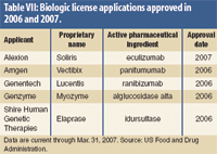 Table VII: Biologic license applications approved in 2006 and 2007.