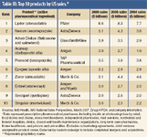 US sales. Pfizer's Lipitor, which garnered the top spot in global pharmaceutical sales, also ranks first among US products (see Table III). Four other products—Nexium, Advair, Aranesp, and Enbrel—also ranked in the top 10 in both global and US pharmaceutical sales, according to IMS Health.