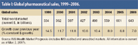 The global pharmaceutical market grew 7.0% (measured in constant US dollars) to $643 billion in 2006, according to IMS Health (Plymouth Meeting, PA), slightly above the 6.8% growth of 2005, when the global market reached $601 billion. (Pharmaceutical sales figures are measured in current US dollars, include prescription and certain over-the-counter data, and reflect ex-manufacturer prices.) In 2006, North America, which accounts for 45% of the global pharmaceutical market, grew 8.3% to $290.1 billion, up from 5.4% in 2005, according to IMS Health. Despite the stronger contribution from the North American market, 2006 was the third consecutive year of single-digit revenue growth for the global pharmaceutical industry (see Table I), following five years of double-digit growth from 1999 to 2003.