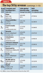 Pharmaceutical Executive's "PharmExec 50" (see Table V), an annual ranking of sales revenues and research and development (R&D) investment of the top 50 pharmaceutical companies, reveals key trends. The top seven spots based on global pharmaceutical sales, secured respectively by Pfizer, GSK, Sanofi-Aventis, Novartis, AstraZeneca, J&J, and Merck & Co., remained the same in 2006. BMS, however, fell out of the top 10, moving from ninth in 2005 to eleventh in 2006. Roche moved to eighth in 2006 from twelfth in 2005 (1).