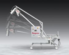 The portable Flexible Screw Conveyor from Flexicon can be tilted and rolled to serve multiple functions. Using a manual jack screw, the support boom and conveyor can be raised for discharging into vessels or other process equipment. When fully lowered, the conveyor can be rolled through doorways as low as 2134 mm in height and aisles as narrow as 1067 mm. Sanitary features include a castor-mounted frame, support boom, and hopper grate constructed of 316 stainless steel, sanitary quick-release clean out cap, quick-disconnect discharge box access cover, stainless control panel with stainless conduit, and liquid-tight compression fittings, allowing wash down during changeovers or conveying of corrosive materials.