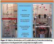 It seems more sensible to use this retrofit option and to be able to wheel the ultrasonic module from vessel to vessel or plant to plant than to build larger ultrasonic reactors. This configuration can also be modified easily to incorporate a secondary feed stream of solute solution or antisolvent directly into the intense ultrasonic field. For techniques such as SAX, the Prosonitron is a key element in large-scale production equipment (see the left of Figure 3).