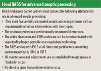 We can define a RABS design that meets industry expectations for advanced aseptic processing (5). To realize that designation we believe the RABS design must possess specific attributes (see sidebar, "Ideal RABS for advanced aseptic processing"). To our knowledge, this type of design has not yet been used, but some operations have come very close to this ideal, and newer technologies may make it feasible. With this type of design, we would also impose the following additional requirements: