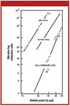 The bubble point had been shown by several experimenters to correlate directly with the log reduction values (LRV) characteristic of a given filter type confronted by a particular type organism (25, 41–43) (see Figure 9). B. diminuta ATCC 19146 was the organism whose different degrees of retention, expressed as LRVs, was shown to correspond to specific bubble-point pressure levels. Establishing the capability of a filter to sustain a challenge level of 1 × 107 cfu of B. diminuta per cm2 of efa, expressed as its bubble point, defines its qualification as a "sterilizing filter." This performance accords with FDA's definition of a sterilizing filter (2). The following equation describes the relationship of the bubble point to the pore's diameter, the dimension most influential on its retention properties: