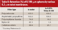 Table II: Retention (%) of 0.198-μm spheres by various 0.2 μm-rated membranes.