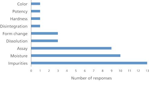 Ten of the companies who responded reported using ‘typical’ accelerated stability assessment program (ASAP) studies to evaluate/model chemical degradation, as published by Ken Waterman et al. (2,3,12–15). The survey responses and literature review show that some companies are using in-house predictive stability approaches (16, 17). The packaging moisture vapor transmission rate (MVTR) was used in the predictions by 12 of the responders, with the source of the MVTR data split fairly even between experimentally derived data, default values in software, and supplier information. Most responders utilized RBPS approaches to model assay/potency or impurities and moisture, as shown in Figure 1. Physical attributes such as dissolution, disintegration, hardness, color, and form changes were also modeled by a small number of respondents. Only two companies, however, reported performing specific stressed stability studies to monitor for physical changes when a shelf life claim is based on predicted chemical stability data. One responder reported focusing on chemical degradation early in development and then performing full ICH stability testing later in development, including physical testing.