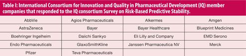 Table I: International Consortium for Innovation and Quality in Pharmaceutical Development (IQ) member companies that responded to the IQ consortium Survey on Risk-Based Predictive Stability.