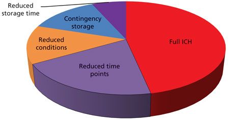 Most of the companies surveyed with RBPS approaches in clinical submissions were using the predictions to set an initial clinical-use period or as supportive stability data. Other applications reported were to demonstrate equivalence, packaging selection, specification justification, and device compatibility. In the majority of cases for clinical submissions, long-term stability testing was also performed and presented in the submissions as shown in Figure 3, although some companies report using reduced protocols (time point and conditions). Two companies reported only holding samples in long-term contingency storage.