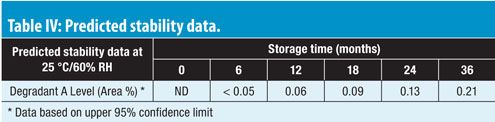 These data were fit to the modified Arrhenius equation (Equation 1). All stability attributes are expected to remain within specification limits for at least 12 months. Modeling predictions for the shelf-life limiting attribute, Degradant A, are included in Table III.