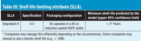 Other non-SLLA drug product attributes were tested following exposure to the conditions studied. This included physical appearance and dissolution. None of the data showed a meaningful change in those attributes. [If no degradation is observed during an ASAP study with conditions such as 70 °C at both high and low humidity for at least three weeks, an initial shelf life of a minimum of 12 months is deemed to be appropriate (11).]