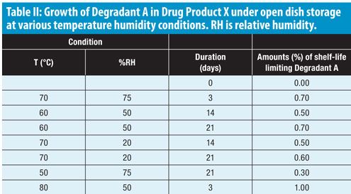 Description of the model used. The ASAP approach was used. This is a statistically designed RBPS program based on the modified Arrhenius equation. The design of the predictive study is based on literature that demonstrates the modeling of observed degradation of solid oral-dosage forms (2,3). Short studies were conducted on open-dish samples of the representative batch of drug product at elevated temperatures over a range of humidity conditions with the goal of reaching the specification limit for the identified SLLA at each condition as detailed as follows. Humidity determines water activity in the drug product and, therefore, can have a significant effect on reaction rates in solid drug products, even for reactions which themselves do not involve water.