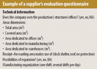 The evaluation of a selected partner may involve several financial and industrial aspects (see sidebar, "Example of a supplier's evaluation questionnaire"). The evaluation should also contain information about the following: