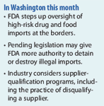 In addition, FDA officials would like Congress to enhance its authority to detain and destroy illegally imported food and drug products. The House of Representatives approved food-import safety legislation last November, but the bill has been stuck in the Senate for several months, largely because of legislators' focus on healthcare reform. The food-safety measure was pulled out of the broader FDA Globalization Act sponsored by Rep. John Dingell (D-MI), which also increases FDA authority to deal with an increasingly global drug supply. Once the food safety measure is enacted, Congressional leaders say they will take up the drug-import provisions. But recent efforts to add to the legislation a ban on bisphenol-A in food containers has drawn strong opposition from the food industry and raised uncertainty about the bill's future.