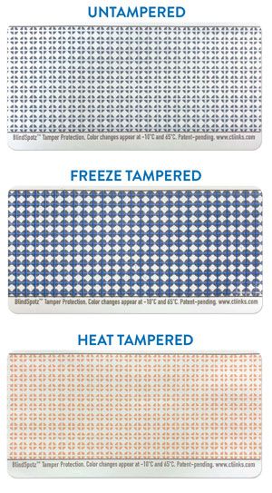 Color-changing BlindSpotz Tamper Heat and Tamper Freeze inks from Chromatic Technologies enable the detection of product tampering by heat and sub-zero temperature exposure. Before the development of the Tamper Freeze inks, most tamper indicators only revealed heat tampering. Lyle Small, the founder of Chromatic Technologies, explains, “Criminals have figured out that the way to get around high-heat tampering indicators is to ‘go cold’ by exposing packaging to very low temperatures. This can ‘delaminate’ many adhesives without activating a tamper-heat indicator. The BlindSpotz Tamper Heat and Tamper Freeze inks eliminate both threats” (2).