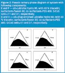 The pseudo‑ternary phase diagrams of oil, surfactant/cosurfactant (S/CoS) and water were developed using the water titration method; the mixtures of oil and S/CoS at certain weight ratios were diluted with water in a dropwise manner. For each phase, diagrams at a specific ratio of S/CoS, 1:1 and 3:1 (w/w), a transparent and homogenous mixture of oil and S/CoS was formed under the mixing by vortexing for 5 min. Each mixture was then titrated with water and visually observed for phase clarity and flowability. The concentrations of water at which turbidity‑to‑transparency and transparency‑to‑turbidity transitions occurred were derived from the weight measurements, and these values were then used to determine the boundaries of the microemulsion domain, corresponding to the chosen value of oils, as well as the S/CoS mixing ratio. The effect of adding triacetin to oil phase‑on‑phase behaviour of the mixture was also studied. To determine the effect of drug addition on microemulsion boundary, phase diagrams were also constructed in drug presence, wherein the oil component was enriched with the drug. Phase diagrams were then constructed using Tri plot v1‑4 software.7