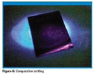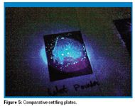 Settling plates.Smooth, stainless-steel coupons can be used as settling plates and placed dry, wet with water, or wet with an adhesive on previously identified critical points. After placing the plates, the mixing operation should be run as normal with a fluorescent agent for a certain amount of time. In an operation that results in much spillage, a time of 5 min normally is sufficient, but operations that result in light spilling can require hours or days. After the operation is finished, the plates should be analyzed under UV light. Comparing the plates side by side helps operators identify the critical points easily (see Figures 4 and 5).