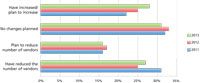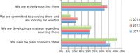 Figure 5: Plans for sourcing in India and ChinaResults from buy-side respondents suggest those concerns may be misplaced. The 2013 survey found a slight decline in the share of bio/pharma company respondents actively sourcing from India and China, and a significant increase in respondents indicating they have no plans to source from suppliers in those countries (see Figure 5). Those responses are consistent with a general sense in the market that interest in sourcing from emerging-market supplies is waning due to eroding cost advantages, concerns about quality, and the complexity of overseeing suppliers halfway around the world.