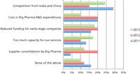 Figure 4: What is the single biggest risk to your business in the next two to three years? As the market for contract services has stabilized, service providers have moved from worrying about demand-related factors to concerns about the competitive environment (see Figure 4). Our 2013 survey saw a big decline in the share of sell-side respondents concerned about R&D spending cuts and supplier consolidation initiatives at global bio/pharma companies as well as a decline in those worried about funding for early-stage companies. Service provider concerns now appear to be focused on competitive issues, especially competition from suppliers in emerging markets and the implications of too much industry capacity.