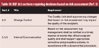 NSF 363 requires risk assessments to support decisions and implement controls (see Tables I–IV). For example, Section 4.2.1 on Documentation requires incorporating quality risk-management principles into changes to the quality-management system (1). The International Conference on Harmonization (ICH) Q9 Quality Risk Management guideline, a reference document for NSF 363, gives two primary principles: "The evaluation of the risk to quality should be based on scientific knowledge and ultimately link to the protection of the patient" and "the level of effort, formality, and documentation of the quality risk management process should be commensurate with the level of risk" (3).