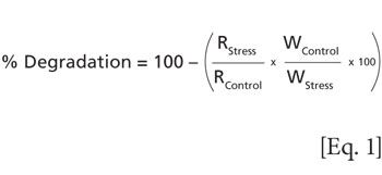 The percentage degradation is calculated relatively to the control, non-stressed sample, by Equation 1.