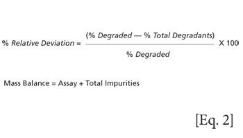 When degradation is between 10% and 15%, the lack of mass balance is identified by more than 50% relative deviation (Equation 2). For results showing degradation is between 5% and 10%, the lack of mass balance is identified by more than 60% relative deviation, and this changes to 70% relative deviation when degradation is between 2% and 5%. When degradation is less than 2%, results are not amenable to mass balance consideration. However, it should be noted that degradation often results in degradation products that may have different absorbance characteristics, so mass balance criteria cannot always be met.