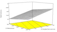 In the described example, the results of the experimental design allowed the number of potential critical parameters for the initial screening to be reduced to eight. These eight parameters were then investigated using a more comprehensive 3-level design. This type of design, also referred to as a response surface method (RSM), will require more experiments. The previous 2-level screening design is used to minimize the number of parameters investigated so as to minimize the number of experiments at the 3-level design stage. In this example, the results of the 3-level design enabled statistically significant models to be calculated showing the effects of the critical parameters on a number of product attributes. A graphical example of a model displaying the influence of granulator final screen size and roller pressure on tablet hardness is shown in Figure 9. As can be seen, as the roller pressure and granulating screen size decreases, the tablet hardness increases.