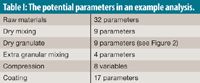 Step 2: Ranking of process parameters in order of importance. The list was analyzed using a risk-assessment approach to prioritize the parameters. Parameters graded as high risk were progressed for investigation. An example parameter rating form is presented in Figure 3. The example shows a parameter rating form focusing on the nine parameters from the dry-granulation stage that may have an effect on the CQAs. A separate rating form would be completed for each stage of the manufacturing process. A scoring system, ranging from 1 being minimal effect, 3 being moderate, and 9 having a major effect on product attributes, was used. This scoring approach applies a much greater weighting to parameters deemed to impact a product's attributes significantly, thus increasing the necessity to further study the effect of the particular variable.
