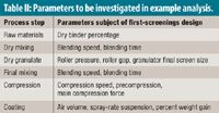 Step 4: Determine the parameters to be investigated experimentally. Following a full analysis using prior knowledge and experience of the formulation and the manufacturing techniques, conclusions will be drawn from the risk-based classification process to list the parameters to be investigated using a first-screening experimental design (see Table II).