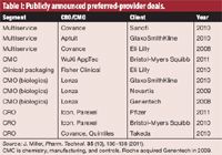 Facing pressure to improve timelines in drug development and reduce costs in drug development and commercialization, the pharmaceutical majors are increasing their level of external development and manufacturing. At the same time, they are looking to manage these external relationships more efficiently and cost-effectively. The result is the preferred-provider relationship in outsourcing. Unlike simple transactional or fee-for-service outsourcing, preferred-provider relationships represent a deeper, more collaborative, and enhanced strategic partnership between sponsor companies and their third-party providers and satisfy an interest by pharmaceutical companies to work with fewer suppliers. During the past several years, select pharmaceutical majors have entered into preferred-provider relationships, particularly with CROs, although manufacturing-based relationships also have been formed.