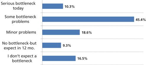 Downstream purification including chromatography continues to be the area cited as requiring the most technological improvements. Yet, other recent BioPlan studies confirm that downstream yield improvements remain much more resistant to change. This year, 74.3% of respondents reported their facility was experiencing at least some capacity bottleneck due to downstream processes. Overall, respondents are experiencing a higher level of bottlenecks than seen in 2011–2015. Approximately 10% reported that their facility is currently experiencing “serious” downstream bottleneck problems. CMOs perceive downstream bottlenecks as more serious, with 60% of CMO respondents reporting either “Serious” or “Some” capacity constraints due to downstream processing. “Serious” capacity constraints were also reported much more frequently by European vs. US respondents, 11.5% vs. 5.7% (see Figure 2).