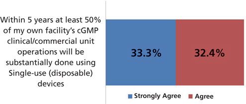 And the industry itself expects to see continued adoption. A significant majority (66%) expect their own facility to involve at least 50% of its substantial unit operations to be done using single-use system devices (see Figure 3).