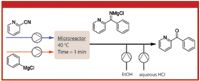 Accelerated and economic process development for large-scale synthesis. Microreactors have simple and pragmatic advantages over traditional batch vessels. They take up less space on the factory floor, but can be used to make large quantities of product. 2-Benzoyl pyridine is an important building block and has annual demand of about 15 metric tons. It is synthesized through a Grignard reaction (see Figure 7). In a microreactor, this reaction takes less than one minute. The Grignard microreaction is followed by two on-line quench modules. Precise reaction control leads to a highly pure crude product, thereby making a distillation step unnecessary, as would be the case for purification of the lower quality batch product.