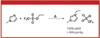 Precise control of the reaction temperature. The production of certain ionic liquids in high purity is a special challenge. The reaction between imidazole derivatives and sulfonates is extremely exothermic (see Figure 4). Conventional batch-synthesis procedures fail to yield products with purities higher than about 96%. Even with very slow dosing times and careful cooling, batch reactors are heated by the reaction. Investigations at Sigma Aldrich (Buchs, St. Gallen, Switzerland) showed that severe brown impurities are formed if the temperature rises above 20 °C in any part of the batch reactor, which leads to a miscolored product. Subsequent purification is troublesome and can only be achieved with huge efforts. Microreactors provide an ideal way out of this dilemma. Their superior heat-exchange capabilities make it possible to carry out the synthesis with neat reagents at an external cooling of only –3 °C. Under these conditions, the temperature inside the microreactor in the reaction zone is kept at a constant value of 8 °C, thus allowing ionic liquids to be produced with a purity exceeding 99% with only traces of undesired materials. Because neat reagents can be used without any solvent, the output of this procedure is very high.