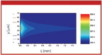 Because of their small surface-to-volume ratio, microreactors can absorb heat created from a reaction much more efficiently than a batch reactor can. Figure 1 shows the initial heat distribution for a neutralization-model reaction in a simulated 5-m3 batch reactor stirred at 500 rpm. The batch reactor is heated by an exothermic reaction. Cooling only takes place at the surface of the reactor. As a result, there is a strong temperature gradient of about 10 °C from the surface of the reactor to its center. In a microreactor, the heat created by mixing the two reagents is also detectable, but the temperature gradient is much smaller, only 3 °C (see Figure 2). Additionally, it only takes a few millimeters of path length for the reagent stream to cool down again to the temperature of the outside-cooling medium. The formation of hot spots or the accumulation of reaction heat may favor undesirable side reactions or fragmentation (see Figure 3). Microreactors, with their superior heat-exchange efficiency, present a perfect solution. Precise temperature control affords suppression of undesired byproducts.