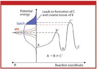 Figure 3: Temperature control in a microreactor (MR) enhances product quality by suppressing side reactions. A is the reagent, B is the product, C is the undesired byproduct from a side reaction, and B and C are intermediate stages. (FIGURE COURTESY OF SAFC)