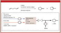 Complete suppression of side reactions. The cyclization of 1,5-hexadiene to exomethylenecyclopentane poses multiple challenges. The batch reaction affords an inseparable mixture of the endo- and exo- cyclization product (see Figure 5). The desired kinetically favored product isomerizes under reaction conditions in the presence of the catalyst. Separation of the two isomers is difficult because both have virtually the same boiling point. In addition, the transition-metal catalyst used for this transformation requires a minimum working temperature of 55 °C. At this temperature, the starting material evaporates.