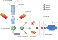For mass detection to work, various analyte components that elute from the chromatographic column must become ionized. Ionization may be achieved using electro-spray ionization (ESI). An example of an MS detector (MDS SCIEX, AB Sciex) is depicted in Figure 1, and Figure 2 depicts the layout of the electrospray of an MS detector. As shown in Figure 2, the effluent from the HPLC column is directed through a nebulizer that is maintained under a high voltage. The voltage can be selected for either positive or negative polarity depending on the conditions required for the components of interest. The charged droplets are subjected to heat to remove solvent, which creates a charged aerosol that is directed into the MS quadrupole.