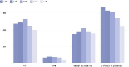 Based on the Pearson correlation coefficient calculation of X values (domestic inspections) and Y values (number of VAI/OAI), the value of R is 0.9443, suggesting a strong positive correlation between X and Y variables. The p-value is 0.015648, hence statistically significant (<0.05). The correlation was not seen when VAI/OAI numbers were compared with foreign inspection trend. It can be, therefore, concluded that there is a higher tendency to generate VAI/OAI observations if the domestic inspection rate increases.
