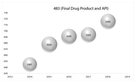 Analysis of FDA Form 483 observations issued from 2014 to 2018 revealed that the number of 483 forms issued has increased during this time period, while the number of observations has declined. The number of VAI and OAI observations issued has also fallen since 2017.