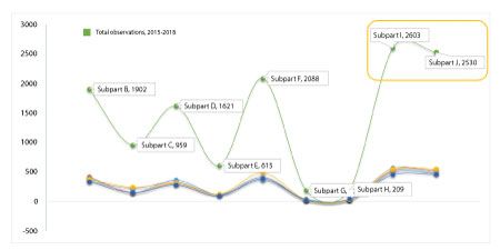 Increased inspection of laboratory controls (Subpart I) may also result in increased good document practices, records and reports observations (Subpart J) based on the positive correlation observed. It is also noteworthy that there was an increase in packaging and labeling control (Subpart G) observations in 2018.
