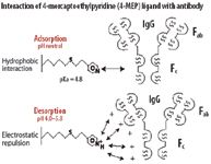 Like Protein A, the synthetic sorbents bind preferentially to the antibody's Fc fragment. Unlike Protein A, though, MEP and MBI bind much more strongly to aggregated or misfolded antibody than to the properly folded monomer. This differential binding lets process designers capture antibody and remove aggregates in a single chromatographic step.
