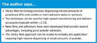 Powder handling is technically challenging at the best of times, but accurately filling capsules with milligram quantities of potent APIs at the manufacturing speeds and outputs required for a blockbuster product adds another layer of complexity. Manufacturers usually overcome this hurdle by bulking out actives with excipients and using mixtures for tablet pressing or capsule filling; however, there is considerable commercial interest in developing highspeed manufacturing technologies that can dispense pure active powders. A technology that can accomplish this is Sticky Web.