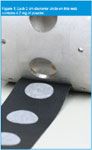 Figure 1 shows a powder dispensing drum and coated film web ready for die cutting into individual doses. Each 2cm diameter area shown contains approximately 4.7 mg of API. The substrate is approximately 30 μm thick, giving a total coated thickness of approximately 100 μm, which allows the films to be easily rolled or folded for encapsulation or further processing. The technology also enables packaging processes to be fully merged and automated into a complete, continuous commercial production line.
