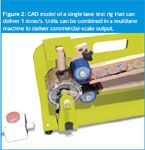 Figure 2 shows a 3D computer-aided design model of a test rig unit delivering one dose per second. Further optimization, however, could improve this rate; for example, a multiple lane production machine with 16 lines in parallel would deliver approximately 60000 doses per hour.