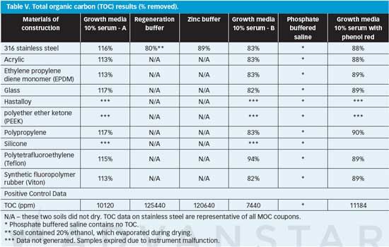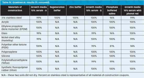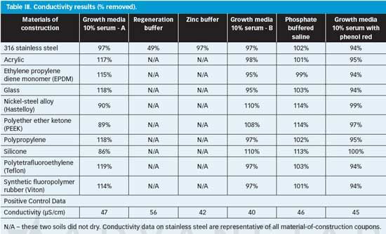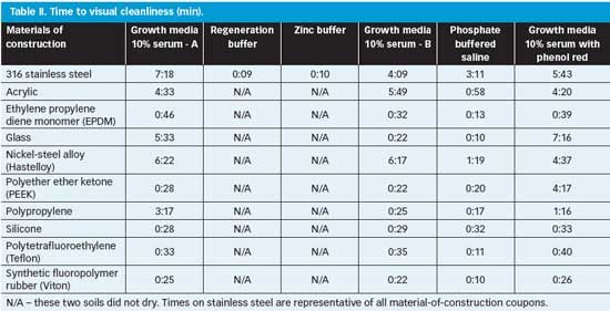 The conductivity results shown in Table III demonstrated high percentage of removal from all of the materials of contruction for each of the soils except for the regeneration buffer with 20% ethanol, which evaporated during the coupon drying. Removals greater than 100% can be attributed to day-to-day variance in calibration of the conductivity meter. Conductivity, however, could be misleading. The conductivity readings began to plateau well before the coupons became visually clean. The conductivity levels of the fully dissolved soils were relatively low (<60 µS/cm). Use of conductivity measurements should confirm the conductivity of the soils and should graph the rate of soil removal during cleanability testing and compared to visual endpoint measurements.