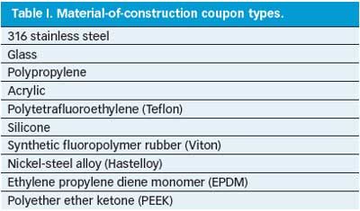 The cleanability study was conducted to determine ease of cleaning for a variety of soils on a range of material-of-construction coupons using the following parameters. Table I lists 10 material-of-construction coupon types, which are among the commonly used materials of construction in pharmaceutical and biopharmaceutical manufacturing. All 10 materials of construction were tested during the study.