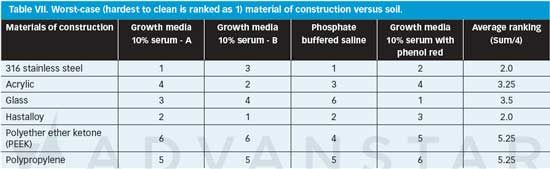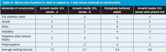 The evaluation of the data to identify the worst-case soil on the hardest-to-clean material of construction should be done in tandem. Table VI ranks the four retained soils on each material of construction from 1 to 4, with 1 being the hardest to clean. The rankings were then averaged across the soils and Media A was determined to be the hardest to clean soil by a small margin over the media with phenol red.