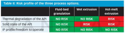 Risk profile. Table II shows a simple risk profile established for the purpose of the example. The current fluid-bed granulation process is not associated with any risks, as it is currently used in production. However, for wet and hot-melt extrusion technologies, the risks associated with the API’s thermal degradation and post-processing solid-state profile were identified for further evaluation using laboratory-based analysis and experimental trials.